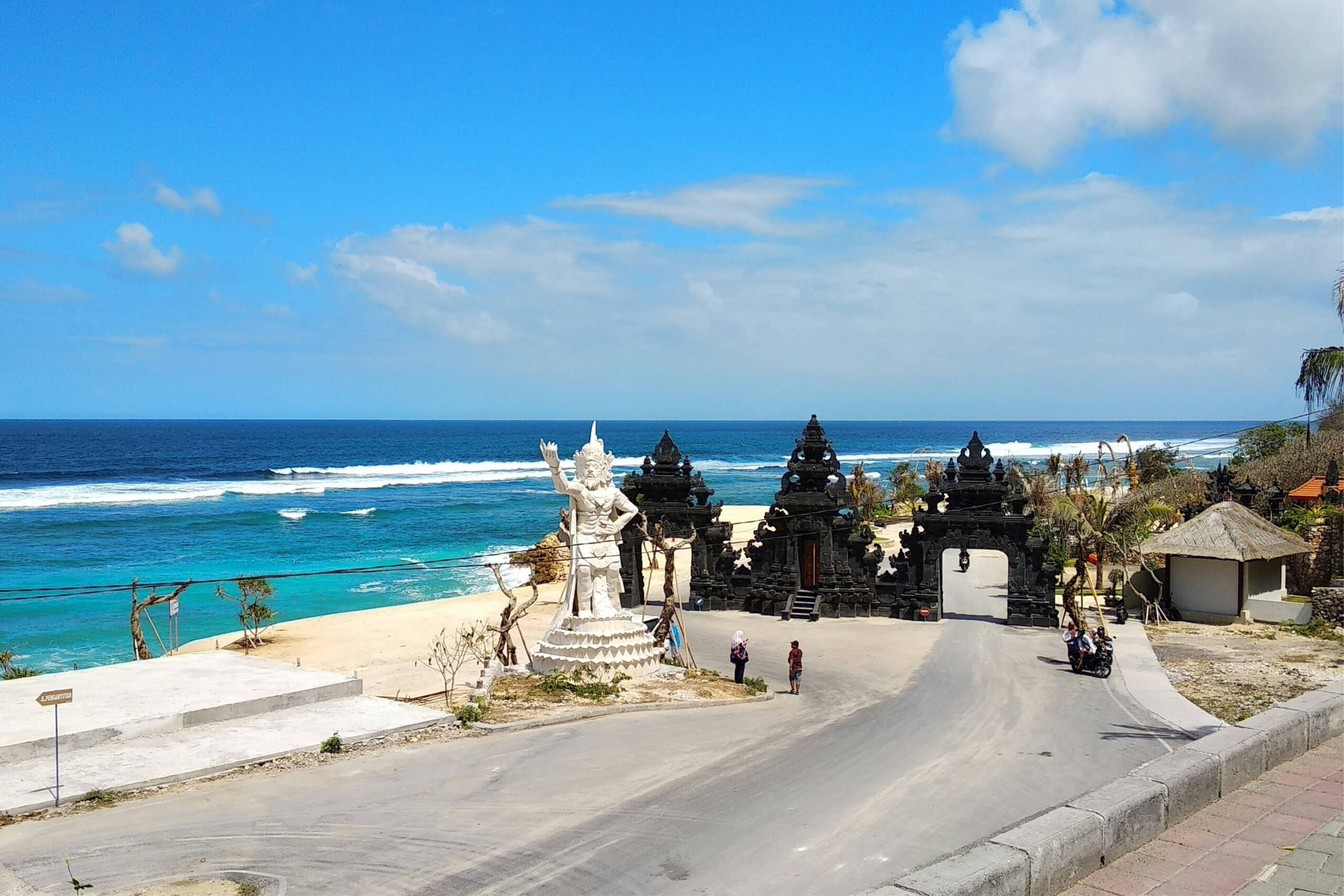 The main point of interest of Melasti Beach Bali in Ungasan is on the access road to the beach location. You must pass through a winding derivative path above the towering white limestone cliffs to get to the beach shore.