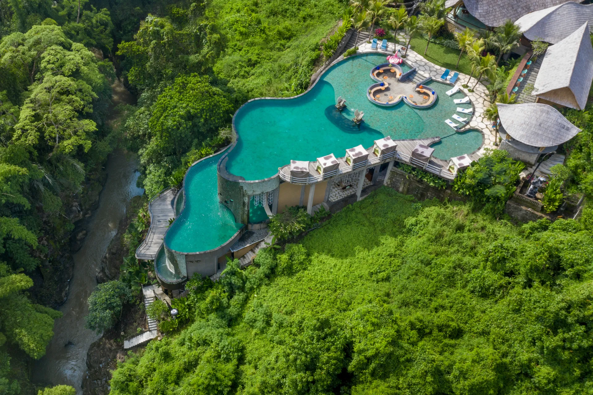 A luxurious escape from modern life into a tropical river pool club with a world-class facility to indulge in the authentic flavors of Indonesian cuisine, phenomenally designed infinity two swimming pools overlooking scenic riverside views, swim-up pool bar, signature spa treatments, love rituals, tailor-made layout meeting spaces to host events of any kind, and a large parking area. Singapadu village is strategically located south of Ubud and is well-known as the Balinese visual art hub of sandstone sculptures. The airport in Bali, Ngurah Rai Denpasar, is only a one-hour drive away.